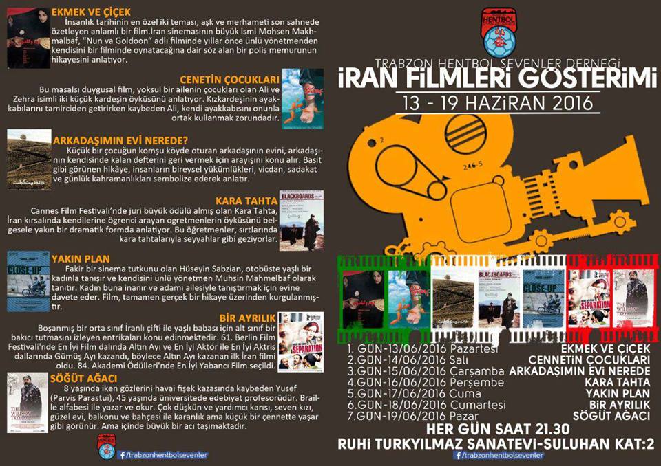 İran filmleri gösterimi, Trabzon Meydanı, Suluhan 2. kattaki Ruhi Türkyılmaz Sanatevi'nde, 13-19 Haziran tarihleri arasında, her gün saat 21:30'da gerçekleştirilecek. Trabzon Hentbol Sevenler Derneği tarafından düzenlenen sinema günleri, ücretsiz olacak.